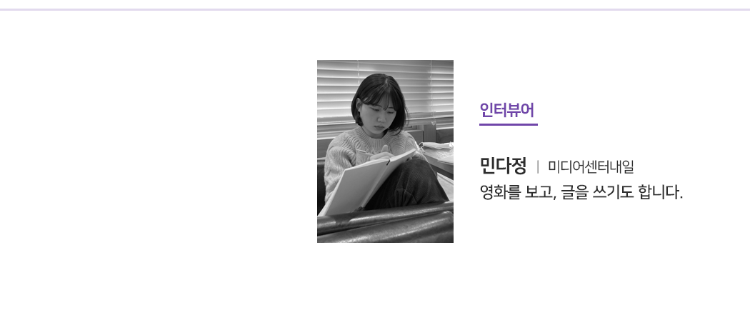 제 고향이 창원인데, 어렸을 때 그저 영화가 좋아서 지역에서 영화를 하고 있는 분들을 찾아갔던 것 같아요. 창원에서 활동하고 계시는 김재한 감독님 사무실에서 <시민케인> 같은 영화를 처음 보기도 하고, 고등학교 2학년 때 경남에서 영화를 제작할 수 있는 워크숍 프로그램에 참여해 박재현 감독님을 만나 처음 작품을 만들었던 기억이 나요. 그 작품이 청소년 영화제 은상을 받기도 하고 그랬죠. (웃음).